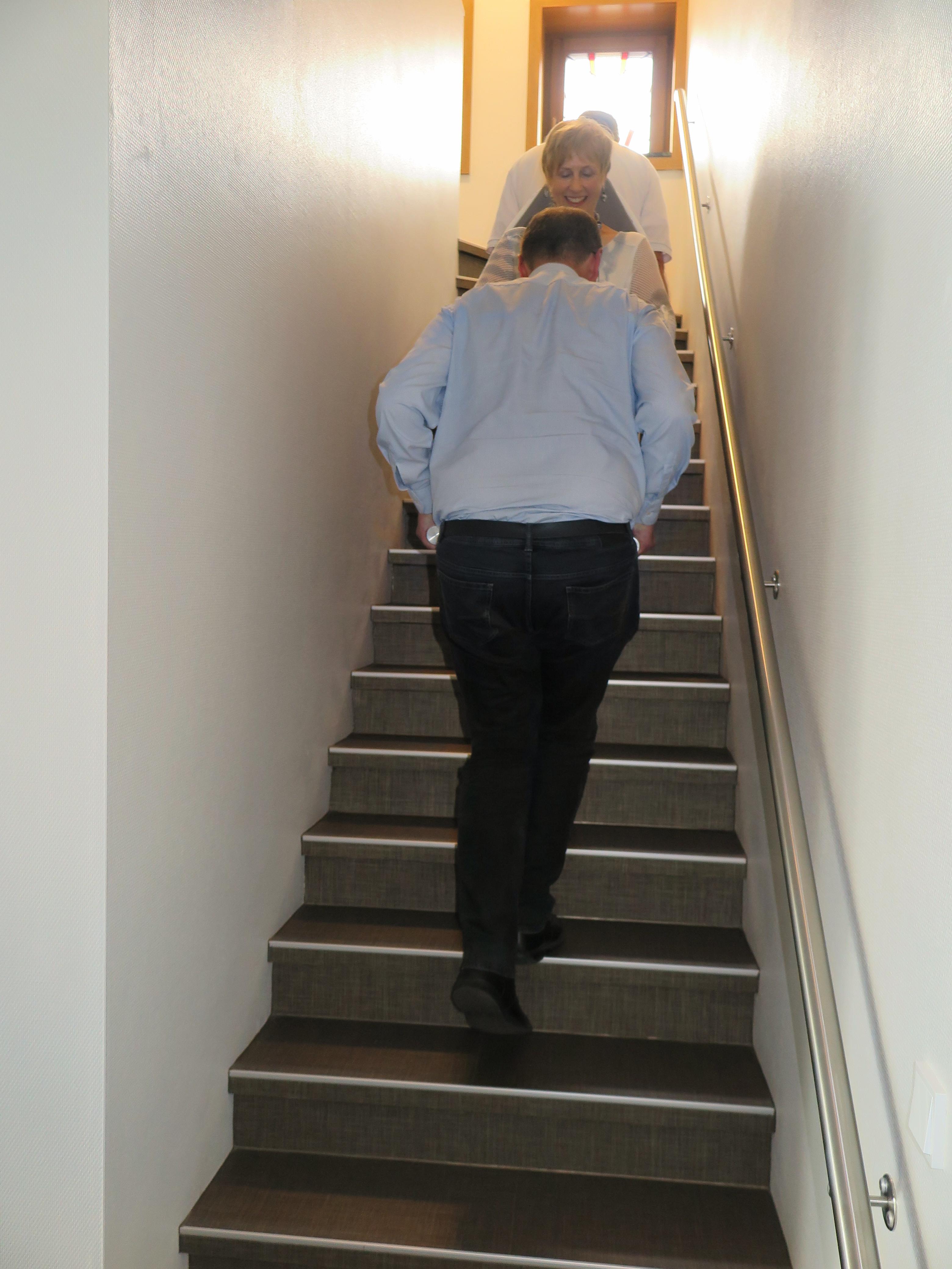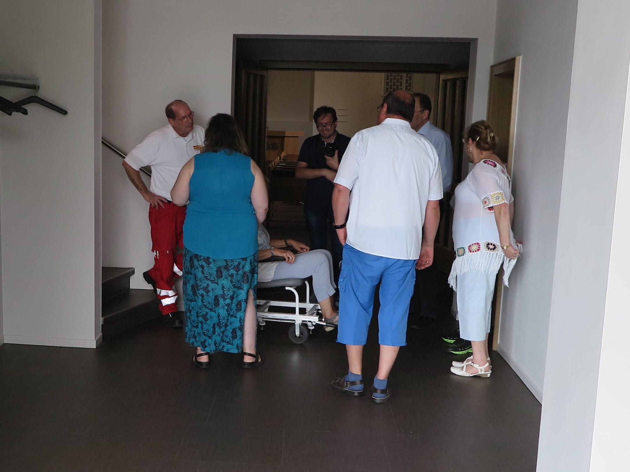 Diakon Stephan Büsing aus der Gemeinde Burgdorf gab die Anregung, ggf. mit einem Krankentransportdienst zu kooperieren, um Personen mit Hilfe eines Tragestuhls in oben gelegene Kirchenräume zu tragen. Da er selbst mit einem behindertengerechten Transportfahrzeug angereist war, konnte er den Teilnehmern die Funktion eines Tragestuhls gleich vorstellen